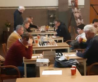 Van de senioren kwamen er ook een aantal leden puur voor de gezelligheid langs. Zo was in het begin van de avond o.a. good-old Frits van den Bergh aanwezig. En ook Rinus Degeling en Robbert Fokkink waren er om even gezellig bij te praten. Waarbij laatstgenoemde ook nog een hele doos schaakboeken aan onze bibliotheek heeft geschonken. Er zitten titels van Max Euwe bij en bijvoorbeeld Michael Tal’s “memorable games”. Dus voor iedereen een goede aanleiding om weer eens een schaakboek te lenen.