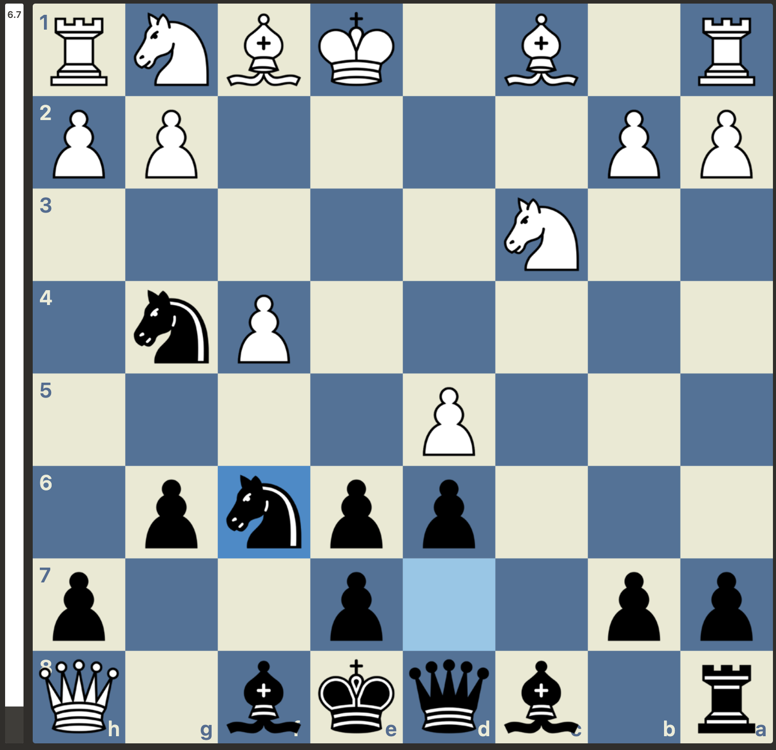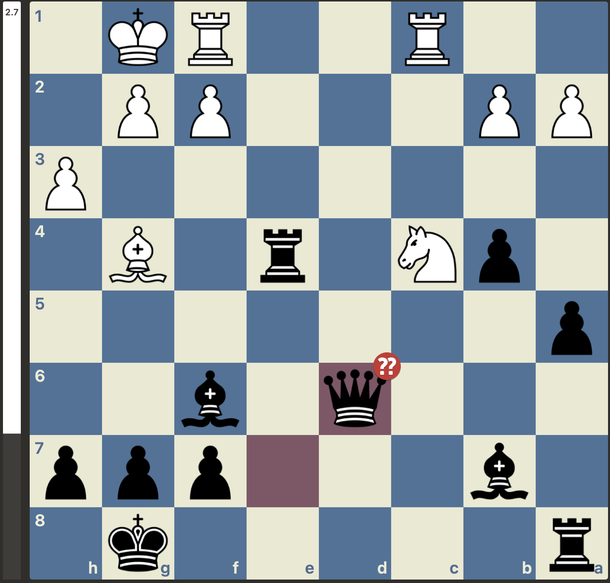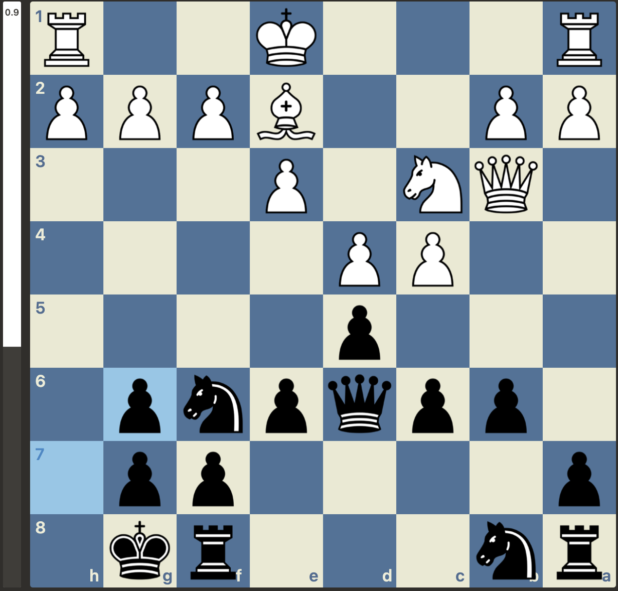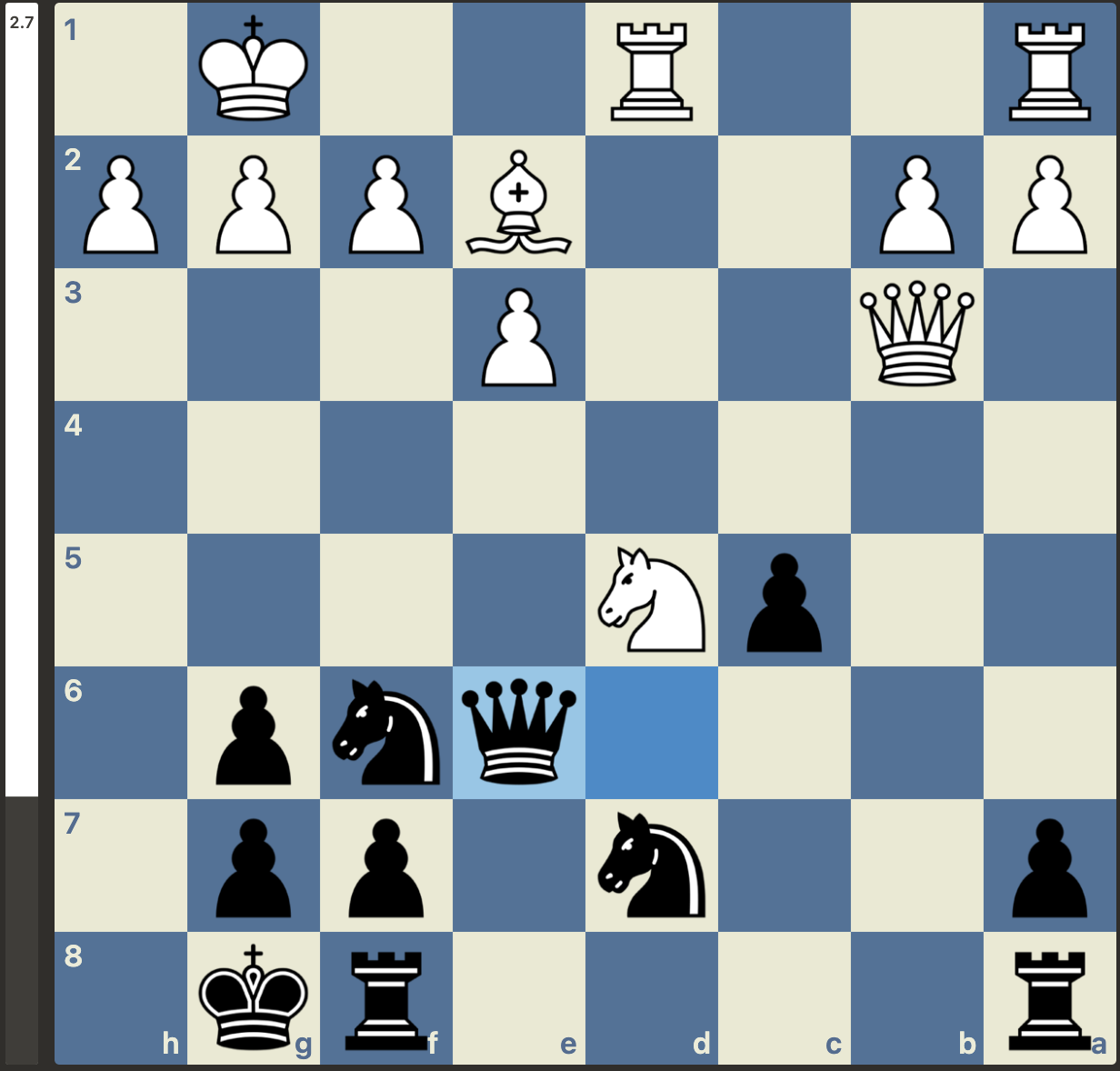 Maar, niet getreurd, gewoon goede zetten vinden, er is nog niets gespeeld. En wat weet Stockfish er nou helemaal van met zijn -3 oordeel. Het plan van Menno was om van de nood een deugd te maken door de dames van het bord te krijgen. Dan zou de vooruitgeschoven koning van wit wel eens een kracht in plaats van een zwakte kunnen worden. Dit plan lukte en wit kwam weer volledig gelijk te staan. Met weliswaar wat uitdagingen in de pionnenstructuur, maar ontwikkelingsvoordeel ter compensatie: