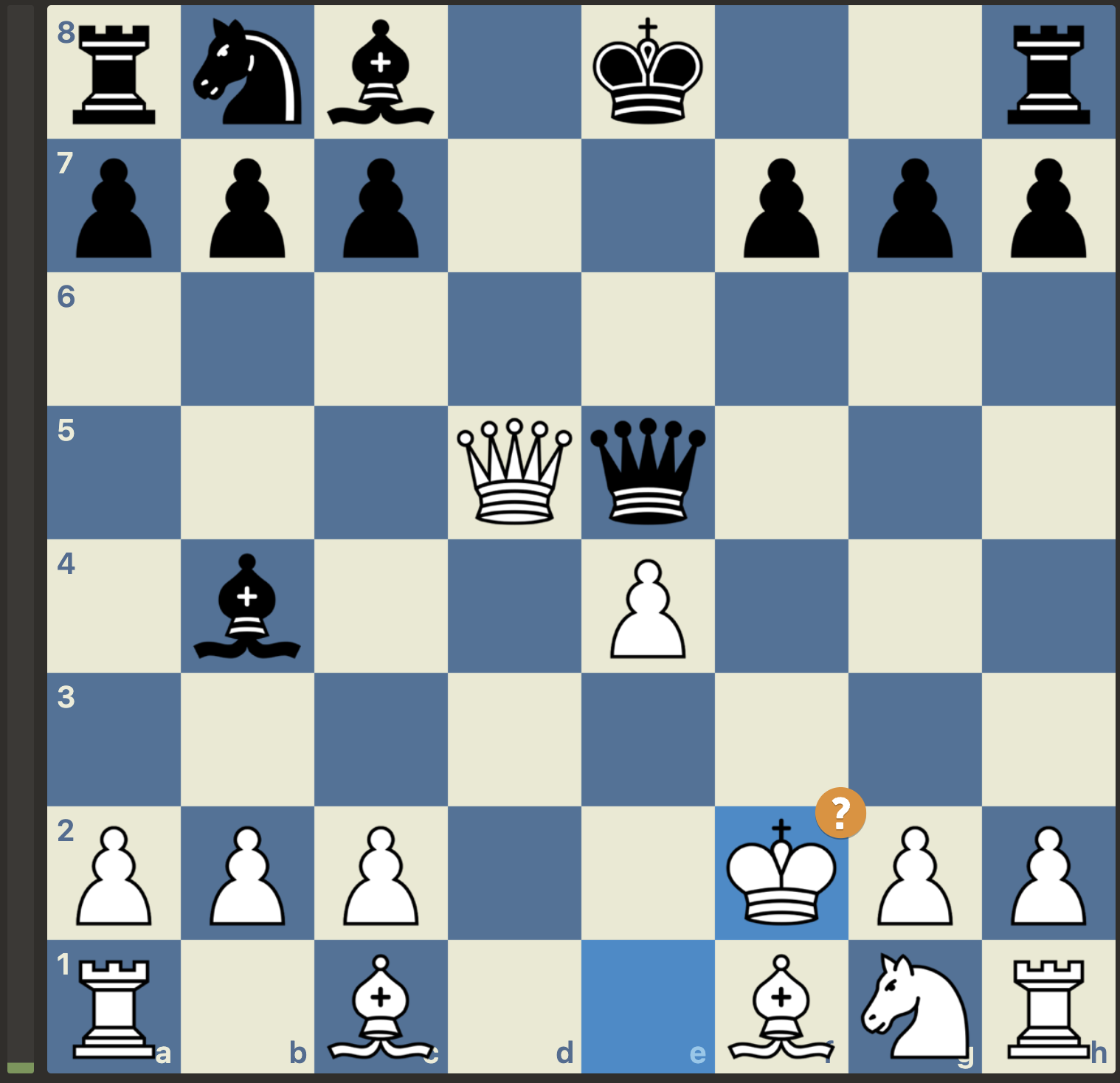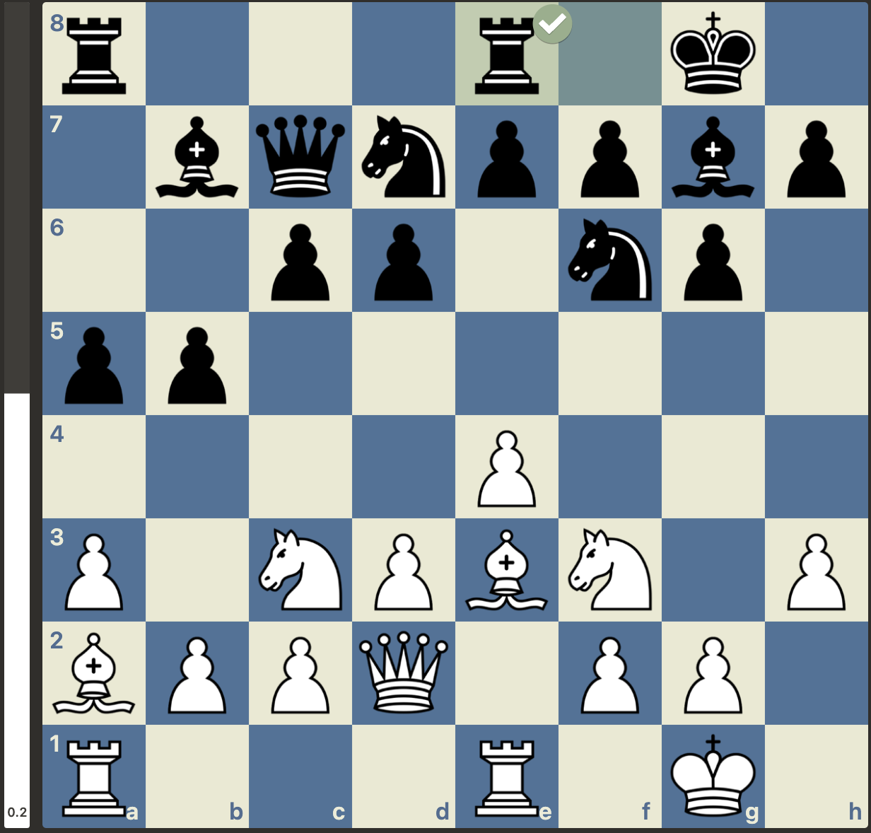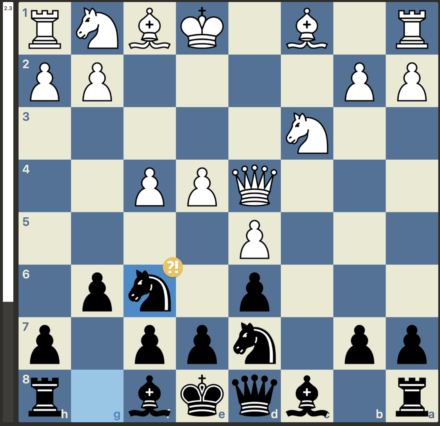 Maar, niet getreurd, gewoon goede zetten vinden, er is nog niets gespeeld. En wat weet Stockfish er nou helemaal van met zijn -3 oordeel. Het plan van Menno was om van de nood een deugd te maken door de dames van het bord te krijgen. Dan zou de vooruitgeschoven koning van wit wel eens een kracht in plaats van een zwakte kunnen worden. Dit plan lukte en wit kwam weer volledig gelijk te staan. Met weliswaar wat uitdagingen in de pionnenstructuur, maar ontwikkelingsvoordeel ter compensatie:
