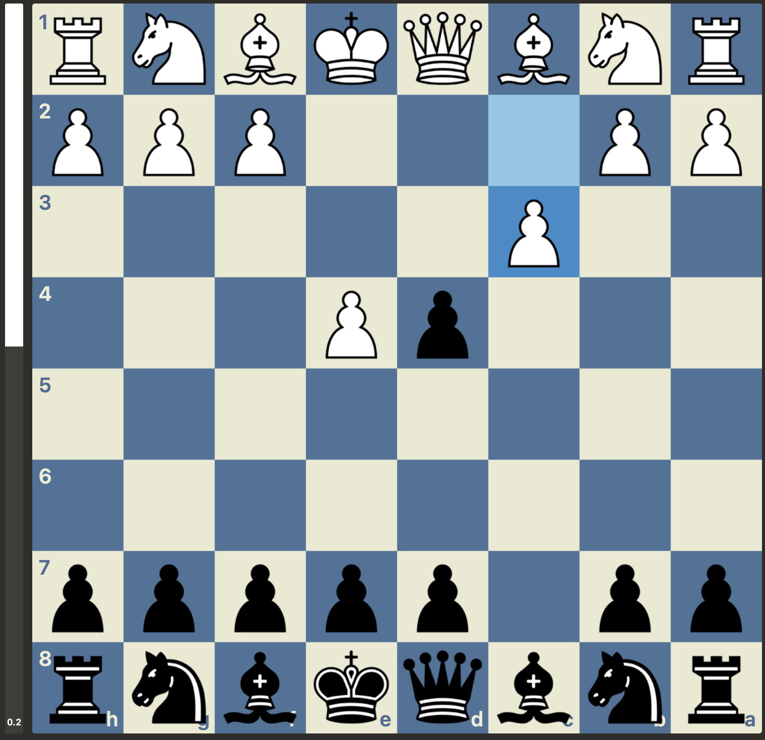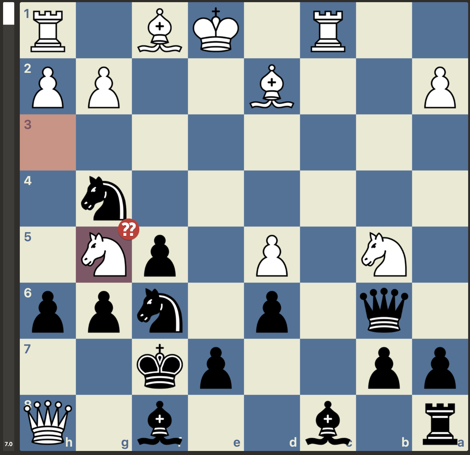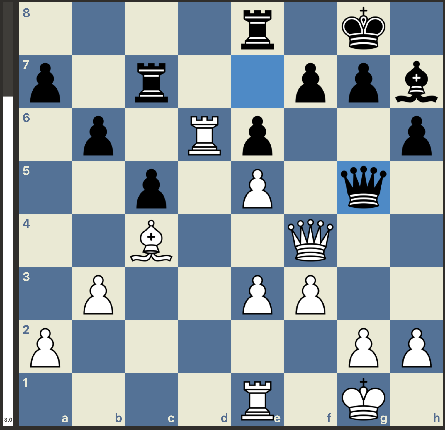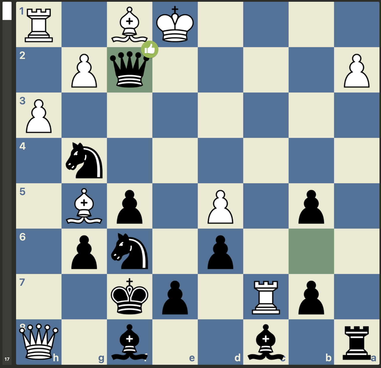 Maar, niet getreurd, gewoon goede zetten vinden, er is nog niets gespeeld. En wat weet Stockfish er nou helemaal van met zijn -3 oordeel. Het plan van Menno was om van de nood een deugd te maken door de dames van het bord te krijgen. Dan zou de vooruitgeschoven koning van wit wel eens een kracht in plaats van een zwakte kunnen worden. Dit plan lukte en wit kwam weer volledig gelijk te staan. Met weliswaar wat uitdagingen in de pionnenstructuur, maar ontwikkelingsvoordeel ter compensatie: