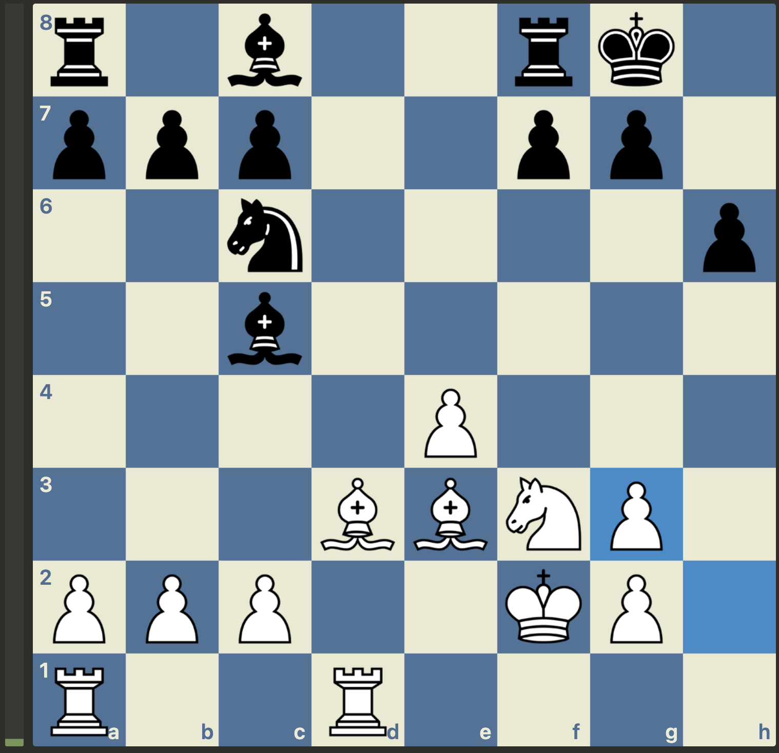 Op zich weinig aan de hand voor zwart, omdat het zwarts slechte loper betreft die eraf gaat en die dubbelpion voor de koning in de praktijk meestal geen een zwakte betekent. Overigens gelooft Cor Feelders naar eigen zeggen niet in slechte lopers, dit terzijde.