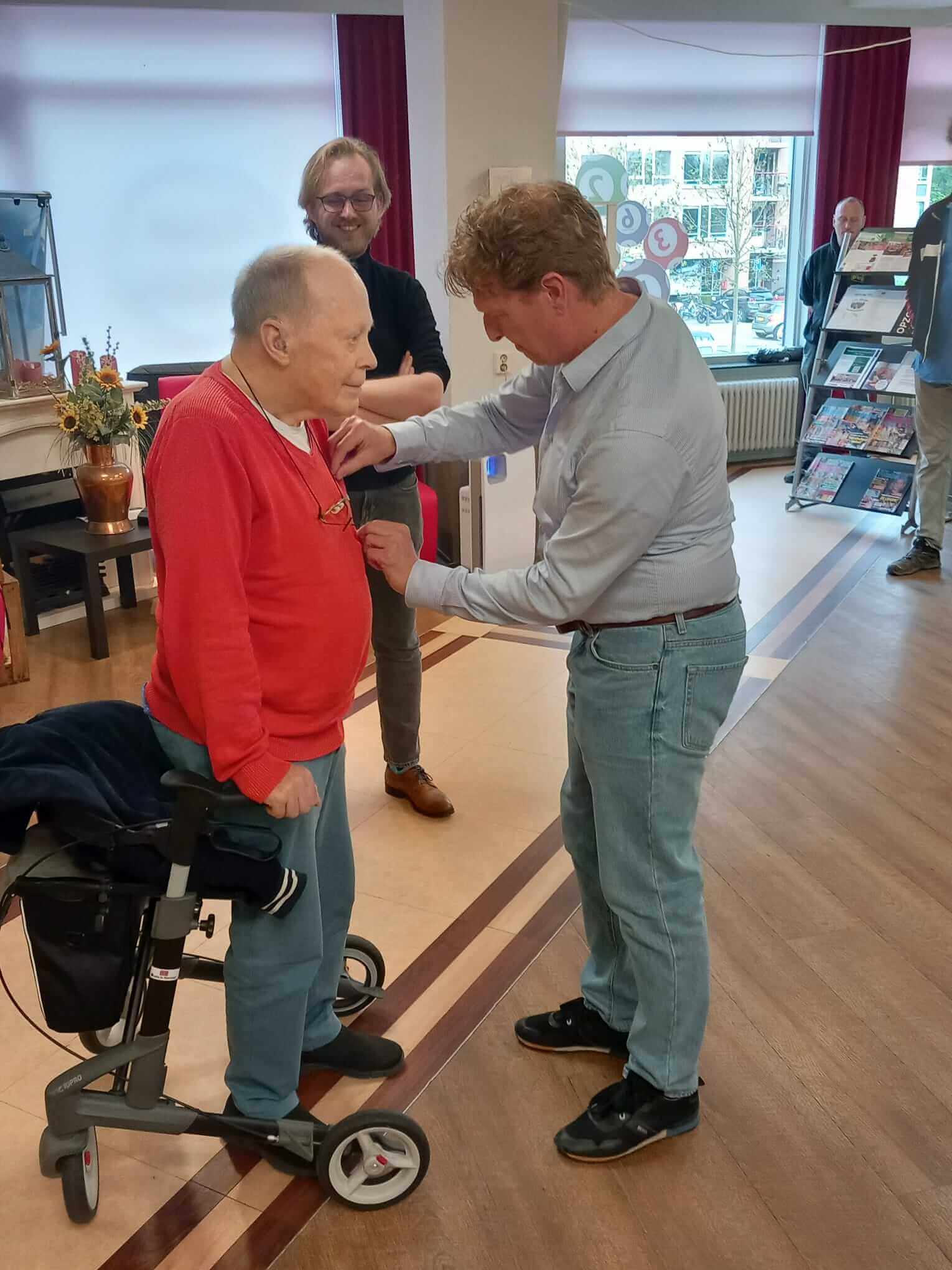 Op 8 mei van dit jaar mochten we Pim nog verrassen. Zijn vele jaren van schaken hadden natuurlijk genoeg prijzen voortgebracht, maar er kwam een onderscheiding waar hij extra trots op leek. Uit de handen van Frank van Zutphen van Erasmus en mijzelf namens Overschie, kreeg Pim een speld aangereikt voor zijn 50 jarig lidmaatschap van de KNSB. Dit voorafgaand aan de vijfde ronde van het Watertorentoernooi, waar hij weer gewoon aan meedeed. De krukken waar hij een tijd lang mee had gelopen waren al een tijd ingewisseld voor een rollator. Als het dan gaat om een vechtersmentaliteit, dan werd dat weeral duidelijk. Hij weigerde te blijven zitten terwijl hij de speld kreeg en toe hij met ietwat vertraging aan zijn partij begon, wist hij een speler met ruim 100 ratingpunten meer te fileren. Allicht door de vleugels die zo’n speldje geven, maar waarschijnlijk vooral door zijn vechtersmentaliteit.