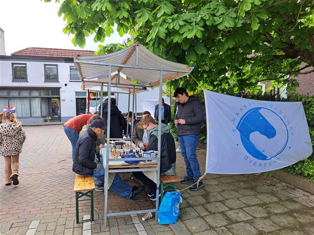 Toen ik zelf rond 4 uur wegging werd er nog steeds fanatiek geschaakt. Allicht dat we volgend jaar maar met 'diensten' moeten gaan draaien om de schaakkraam bezet te houden. Als, net als dit jaar, ook laat in de middag nog enthousiaste schakers arriveren, dan laat dat zien dat er in Overschie en omstreken nog genoeg potentiële leden rondlopen!